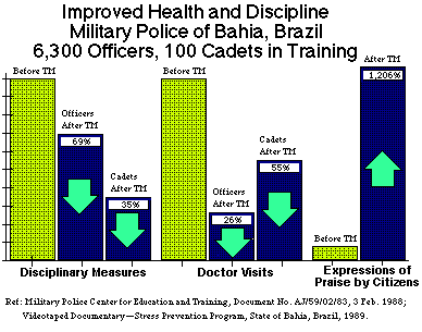 If members of police departments were to learn the TM technique, not only would they have access to a powerful tool for reducing violence, they would also gain benefits such as increases in calmness, clarity of mind, happiness, creativity, and energy, as proven by hundreds of independent research studies. This evidence-based approach is highly effective for stress-related conditions such as PTSD, brain function, and cardiovascular health. Here is a chart which illustrates the significant improvements in health and discipline experienced by officers and cadets practicing the TM program in the State of Bahia, Brazil. These improvements resulted in improved community relations as measured by a dramatic increase (1,206%) in the number of positive reports received by the Police Department from the citizens of Salvador.