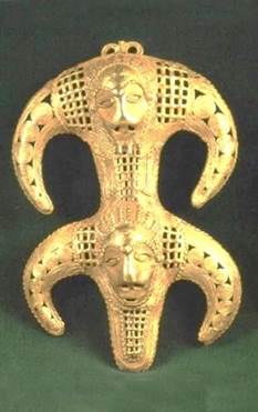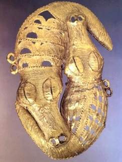 Gold jewel of two crocodiles, Baulé, Côte d’Ivoire, now in Musée du Quai Branly-Jacques Chirac, Paris, France.