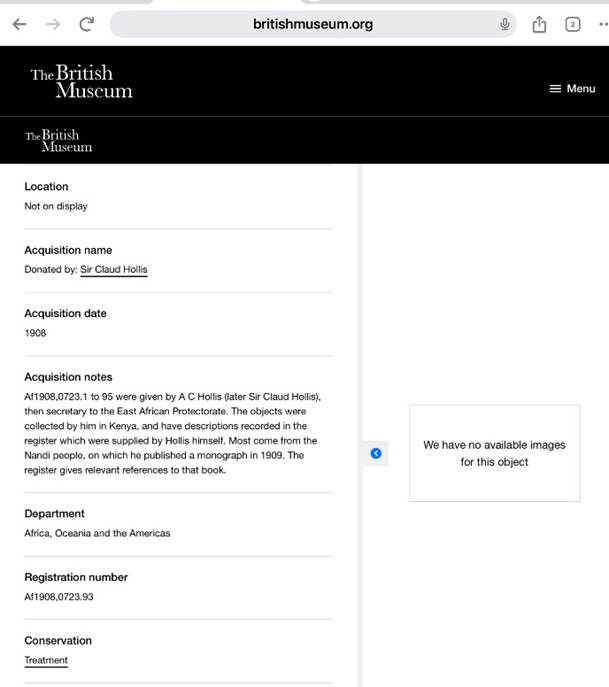 British Museum has no image of Ngandji, Spiritual Drum of the Pokomo, Kenya. Readers must judge for themselves if a statement by a museum that it has no image of a precious spiritual and cultural object of a people looted by colonial masters, is acceptable in our days. The so-called ‘universal museums’ have always prided themselves of showing looted objects to the enormous number of visitors. But what about cases where they are not even showing the object at all and keep it in a storage? Why keep an object you cannot display when the owners are asking for its return?